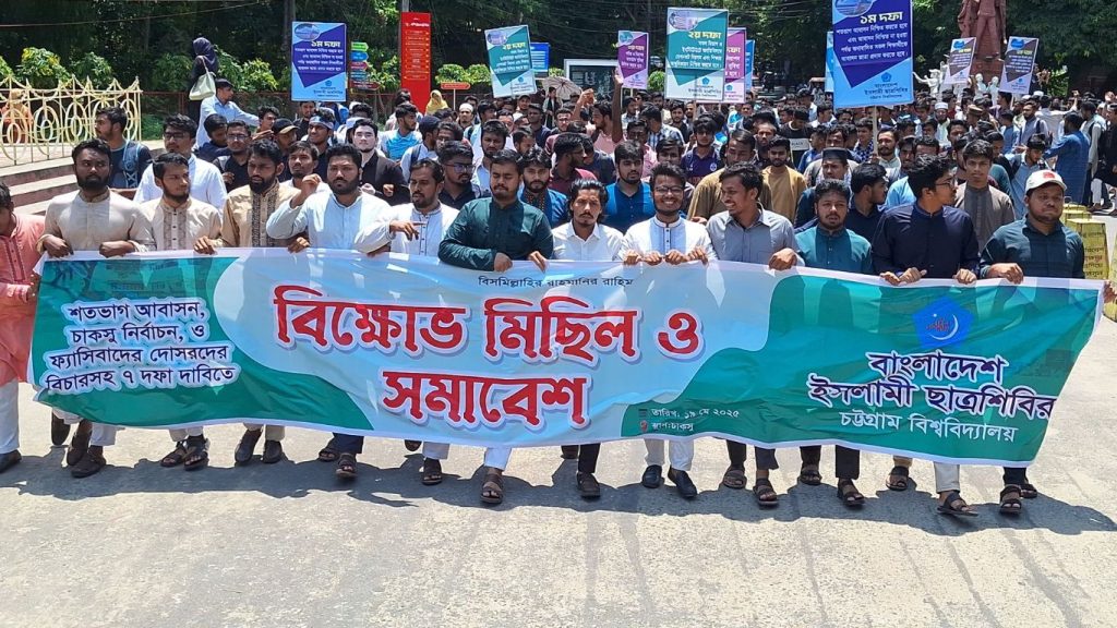 দীর্ঘ একযুগ পর চট্টগ্রাম বিশ্ববিদ্যালয়ে প্রকাশ্য ব্যানারে বিক্ষোভ মিছিল করেছে বাংলাদেশ ইসলামী ছাত্রশিবির চবি শাখা। সোমবার (১৯ মে) দুপুর সাড়ে ১২টায় সংগঠনটি চাকসু ভবনের সামনে থেকে বিক্ষোভ শুরু করে প্রশাসনিক ভবন শহিদ মিনার অতিক্রম করে জিরো পয়েন্টে গিয়ে সংক্ষিপ্ত সমাবেশের মাধ্যমে কর্মসূচি শেষ করে।