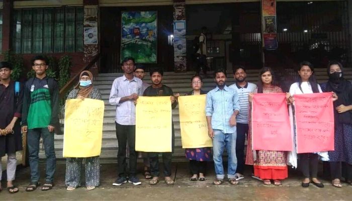 বুধবার (২০ জুলাই) বেলা সোয়া ১২টায় বিশ্ববিদ্যালয়ের কেন্দ্রীয় গ্রন্থাগারের সামনে এ মানববন্ধন অনুষ্ঠিত হয়। শীঘ্রই দাবি পূরণ করা না হলে কঠোর কর্মসূচি দিবেন বলে মানববন্ধন থেকে হুঁশিয়ারি দেন তারা।