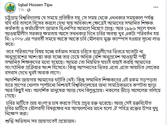 মঙ্গলবার (২৩ ডিসেম্বর) রাতে নিজের ব্যক্তিগত ফেসবুক আইডি থেকে একটি স্ট্যাটাসের মাধ্যমে এসব বলেন টিপু। এতে তিনি চবি আওয়ামী পন্থী শিক্ষকদের মধ্যে শুদ্ধি অভিযানেরও দাবি প্রকাশ করেন।