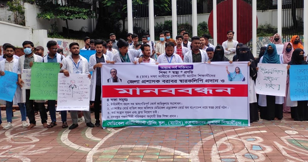 এ্যালাইড হেলথ বোর্ড বাতিল করে অনতিবিলম্বে ‘মেডিকেল এডুকেশন বোর্ড অব বাংলাদেশ’ নামের স্বতন্ত্র বোর্ড গঠনসহ চার দফা দাবিতে কক্সবাজারে মানববন্ধন করেছে মেডিকেল এ্যাসিস্ট্যান্ট ট্রেনিং স্কুল (ম্যাটস) এর শিক্ষার্থীরা। মানববন্ধন শেসে প্রধানমন্ত্রী বরাবরে স্বারকলিপিও প্রদান করা হয়েছে।