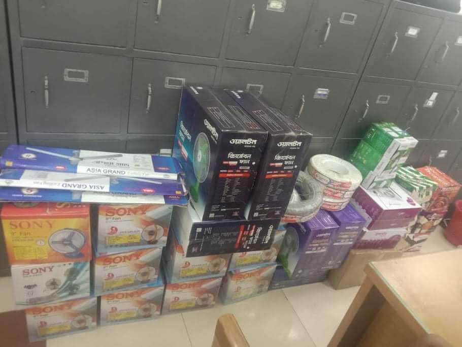 উক্ত মালামালের মধ্যে ছিলো- স্যামফনি সিলিং ফ্যান ০৪ টি, নোভানা সিলিং ফ্যান ০১টি, আল হাবিব সিলিং ফ্যান ০১ টি, সুপার স্টার ১০ ইঞ্চি এক্সস্ট ফ্যান ০২ টি, সুপার স্টার ৩০ ওয়াড LAD বাল্ব ০৬ টি, GPC ১৮ ওয়াড IPS বাল্ব ৪৭ টি, পারটেক্স 2×0.65 RM তার/ক্যাবল ৩.৫ কয়েল, পারটেক্স 2 RM তার/ক্যাবল ০.৫ কয়েল, ১২ ইঞ্চি ওয়ালটন রিচার্জেবল ফ্যান ০৩ টি, ১৪ ইঞ্চি ওয়ালটন রিচার্জেবল ফ্যান ০৩ টি, এশিয়া ফ্যানের পাখা ০৩ প্যাকেট। এসময় উদ্ধারকৃত মালামালগুলো জব্দ করা হয়।