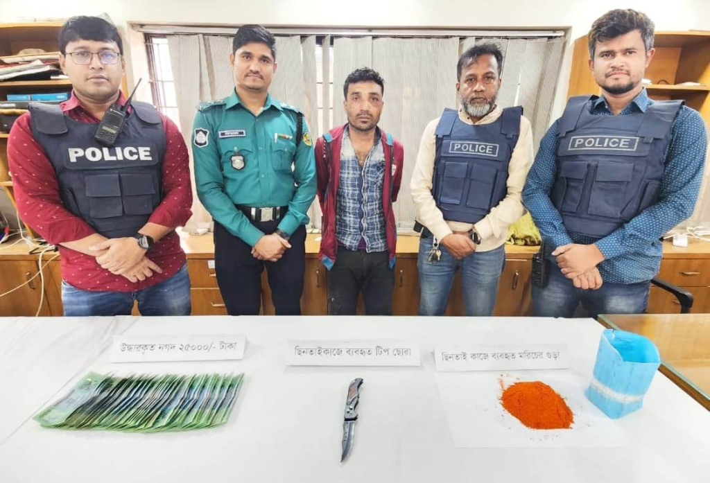চোখে মরিচের গুঁড়া মেরে অভিনব প্রক্রিয়ায় ছিনতাই চক্রের মূলহোতা মিজানুর রহমানকে গ্রেফতার করেছে পুলিশ। এসময় তার কাছ থেকে একটি টিপছোরা, নগদ ২৫ হাজার টাকা, ১২৫ গ্রাম মরিচের গুড়া ও একটি সিএনজি অটোরিকশা উদ্ধার করা হয়।