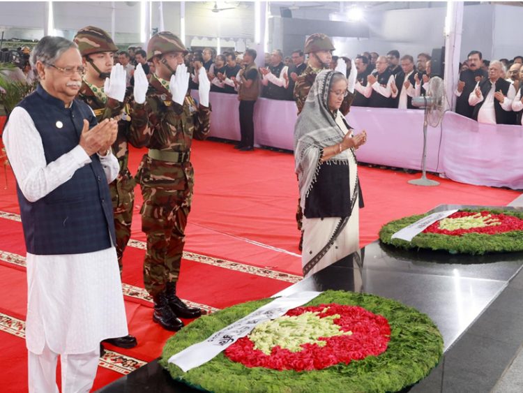 এরপর বঙ্গবন্ধুর প্রতি সম্মান প্রদর্শনের অংশ হিসেবে সেখানে কিছুক্ষণ নীরবে দাঁড়িয়ে থাকেন দু’জন। এ সময় বিউগলে বেজে ওঠে করুণ সুর, আর সশস্ত্র বাহিনীর সুসজ্জিত একটি চৌকস দল জাতির পিতাকে গার্ড অব অনার দেয়। পরে বঙ্গবন্ধুসহ ১৫ আগস্টের নিহতদের রুহের মাগফিরাত কামনা করে বিশেষ মোনাজাত করা হয়।
