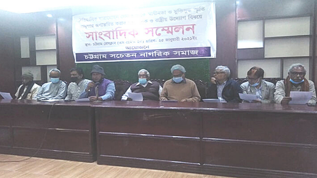 সংবাদ সম্মেলনে লিখিত বক্তব্য পাঠ করেন সাংবাদিক আলিউর রহমান। উপস্থিত ছিলেন মুক্তিযোদ্ধা-গবেষক ডা. মাহফুজুর রহমান, নাট্যজন প্রদীপ দেওয়ানজী, কলেজ শিক্ষক সমিতির সাধারণ সম্পাদক জাহাঙ্গীর আলম, কর্ণফুলী গবেষক ড. ইদ্রিস আলী, ওয়ার্কার্স পার্টির সাধারণ সম্পাদক শরীফ চৌহান, আবৃত্তিকার রাশেদ মাহমুদ, শ্যামল কুমার পালিত, ড. জিনবোধি ভিক্ষু প্রমুখ।