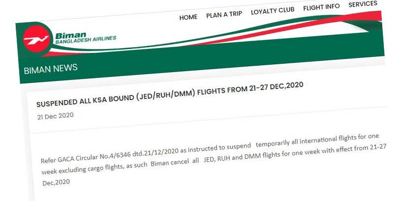 বিশ্বের একাধিক দেশে নতুন ধরনের নভেল করোনাভাইরাসের সংক্রমণজনিত পরিস্থিতি বিবেচনায় এক সপ্তাহের জন্য সৌদি আরবের জেদ্দা, রিয়াদ ও দাম্মামগামী সব ফ্লাইট বাতিল করেছে বিমান বাংলাদেশ এয়ারলাইনস।