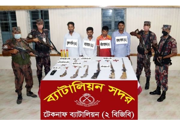 কক্সবাজারের টেকনাফে দেশে তৈরি ৬টি অস্ত্র, ১০ রাউন্ড তাজা কার্তুজ ও অন্যান্য সরঞ্জামসহ ‘ডাকাত দলের’ ৪ সদস্যকে আটক করেছে বিজিবি।