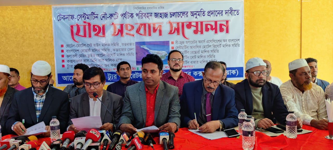 নাব্যতা সংকটের অযুহাতে বন্ধ থাকা ‘টেকনাফ-সেন্টমার্টিন নৌ-রুটে’ পর্যটকবাহি জাহাজ চলাচল দাবিতে মঙ্গলবার (১০ জানুয়ারি) দুপুরে আয়োজিত সংবাদ সম্মেলনে এ দাবি করেছেন পর্যটন সংশ্লিষ্টদের ১০টি সংগঠনের নেতৃবৃন্দ।