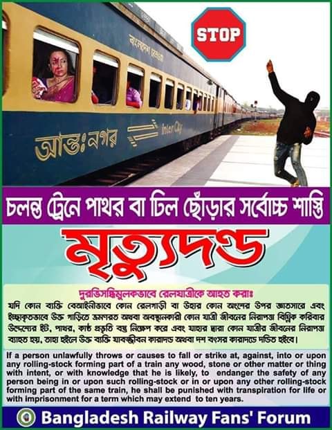 চলন্ত ট্রেনে পাথর বা ঢিল ছোঁড়ার সর্বোচ্চ শাস্তি মৃত্যুদন্ড হলেও বন্ধ হচ্ছেনা  দুষ্কৃতিকারীদের আস্ফালন। রেলওয়ে নিরাপত্তা বাহিনীর দায়িত্বহীনতা ও সচেতনতা সৃষ্টির অভাবে এ ধরনের ঘটনার মাত্রা প্রতিনিয়ত বৃদ্ধি পাচ্ছে। এতে দেশের প্রায় অর্ধশত রুটে প্রতিদিন ট্রেন পরিচালনায় থাকা কর্মকর্তা-কর্মচারী ও যাত্রীরা আতঙ্কগ্রস্থ। মৃত্যুদন্ডের বিধান থাকা সত্বেও  চলন্ত ট্রেনে পাথর মারায় প্রতিনিয়ত ট্রেনের চালক-পরিচালক এমনকি যাত্রীরা।