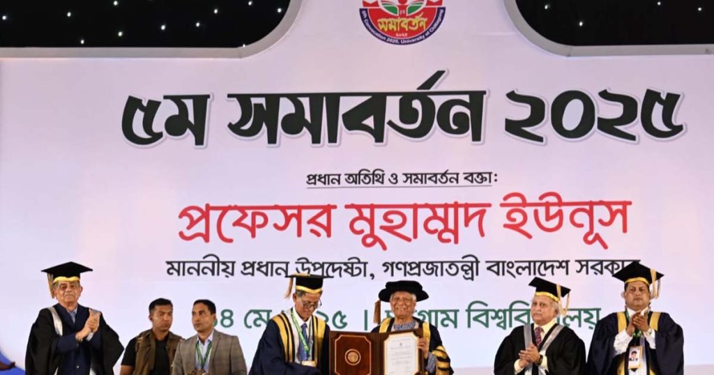 চট্টগ্রাম বিশ্ববিদ্যালয়ের (চবি) পঞ্চম সমাবর্তনে সম্মানসূচক ডক্টরেট অব লিটারেচার (ডি-লিট) ডিগ্রি পেয়েছেন নোবেল শান্তি পুরস্কারপ্রাপ্ত অধ্যাপক ড. মুহাম্মদ ইউনূস।