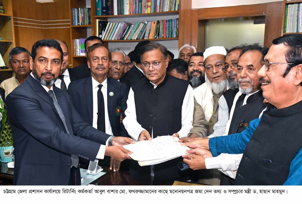 বুধবার (২৯ নভেম্বর) দুপুরে দ্বাদশ জাতীয় সংসদ নির্বাচনে চট্টগ্রাম-৭ আসনে (রাঙ্গুনিয়া-বোয়ালখালি আংশিক) আওয়ামী লীগ মনোনীত প্রার্থী তথ্যমন্ত্রী ড. হাছান মাহমুদ চট্টগ্রামের জেলা প্রশাসক কার্যালয়ে মনোনয়নপত্র জমা দিতে যান। রিটার্নিং কর্মকর্তা ও চট্টগ্রামের জেলা প্রশাসক আবুল বাশার মো. ফখরুজ্জামানের কাছে কয়েকজন দলীয় নেতাকে সাথে নিয়ে মনোনয়নপত্র জমা দেন তিনি।