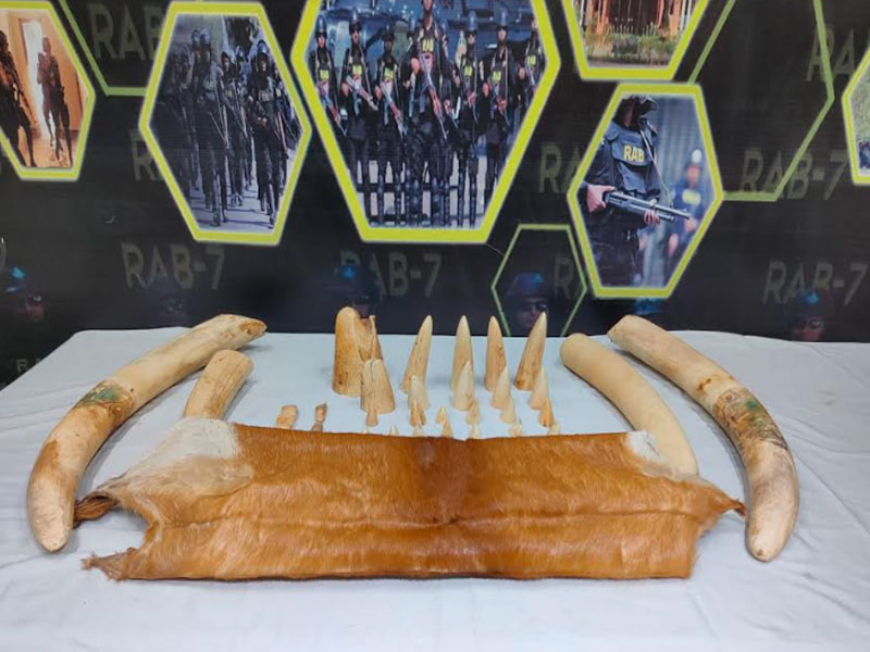 র্যাব-৭ এর সিনিয়র সহকারী পরিচালক মো. নূরুল আবছার জানান, শুলকবহর এলাকার একটি বাড়ির তৃতীয় তলায় হাতির দাঁত ও হরিণের চামড়া বিক্রি করছে- এমন তথ্যের ভিত্তিতে শুক্রবার রাতে অভিযান চালানো হয়। এতে র্যাবের উপস্থিতি টের পেয়ে পালানোর সময় আব্দুল মালেক নামে এক পাচারকারিকে আটক করা হয়। এসময় ওই রুমের খাটের নিচ থেকে একটি সাদা প্লাস্টিকের বস্তা থেকে চারটি হাতির দাঁত, ছোট-বড় ও মাঝারি আকারের ২০টি হাতির দাঁতের খ-াংশ (মোট ১৪ কেজি) এবং একটি হরিণের চামড়া উদ্ধার করা হয়।