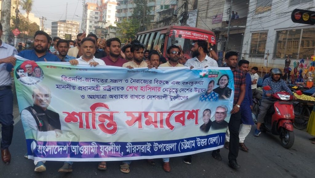 বিএনপি দেশব্যাপী আন্দোলনের নামে সন্ত্রাস, সহিংস, জনগণ ও পুলিশের ওপর হামলার প্রতিবাদে শান্তি সমাবেশ ও মিছিল করেছে মিরসরাই উপজেলা যুবলীগ।