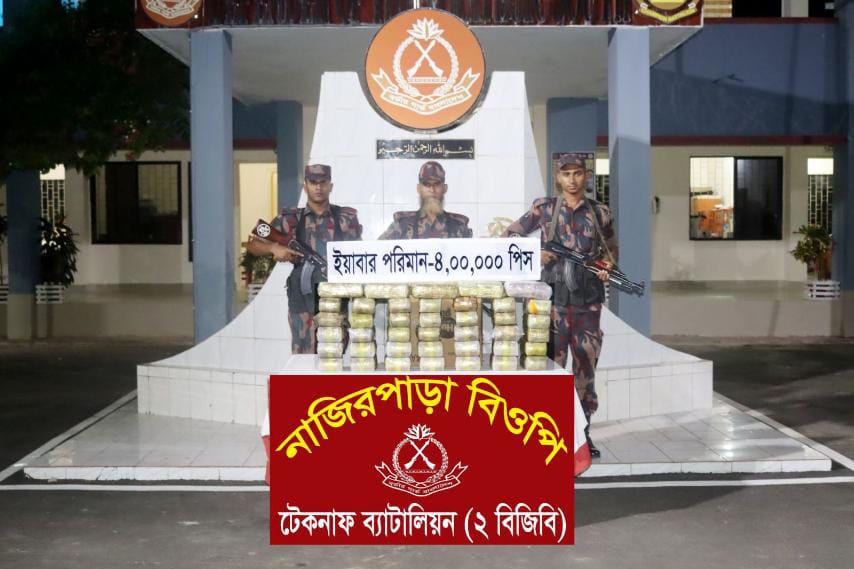 অন্যদিকে, টেকনাফ ২বিজিবির অধিনায়ক লে. কর্ণেল মো. মহিউদ্দীন আহমেদ জানান, মঙ্গলবার (২৫ এপ্রিল) রাত ৮টার দিকে টেকনাফ ২ বিজিবির নাজিরপাড়া বিওপির বিজিবির টহলদল নাফনদীর সংলগ্ন কেওড়া বাগানের ভেতর থেকে মালিকবিহীন ৪লাখ পিস ইয়াবা ট্যাবলেট জব্দ করে। এসময় মাদক পাচার কাজে ব্যবহৃত একটি কাঠের নৌকা জব্দ করা হয়। জব্দকৃত মালিকবিহীন ৪লাখ পিস ইয়াবা ট্যাবলেট ব্যাটালিয়ন সদরের জমা রাখা হয়েছে। পরবর্তী তা ধ্বংস করা হবে বলে উল্লেখ করেন তিনি।
