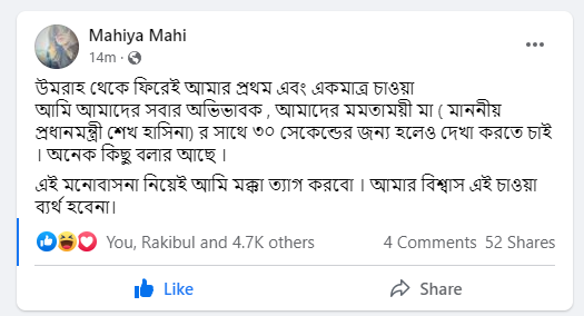 স্ট্যাটাসে চিত্রনায়িকা মাহিয়া মাহি লিখেছেন, ‘উমরাহ থেকে ফিরেই আমার প্রথম এবং একমাত্র চাওয়া আমি আমাদের সবার অভিভাবক, আমাদের মমতাময়ী মা (মাননীয় প্রধানমন্ত্রী শেখ হাসিনা) র সাথে ৩০ সেকেন্ডের জন্য হলেও দেখা করতে চাই। অনেক কিছু বলার আছে। এই মনোবাসনা নিয়েই আমি মক্কা ত্যাগ করবো। আমার বিশ্বাস এই চাওয়া ব্যর্থ হবেনা।’