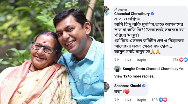 ছবির মন্তব্যে চঞ্চল চৌধুরী লেখেন, ‘ভ্রাতা ও ভগ্নিগন, আমি হিন্দু নাকি মুসলিম, তাতে আপনাদের লাভ বা ক্ষতি কি? সকলেরই সবচেয়ে বড় পরিচয় ‘মানুষ’। ধর্ম নিয়ে এসকল রুচিহীন প্রশ্ন ও বিব্রতকর আলোচনা সকল ক্ষেত্রে বন্ধ হোক। আসুন, সবাই মানুষ হই। ’