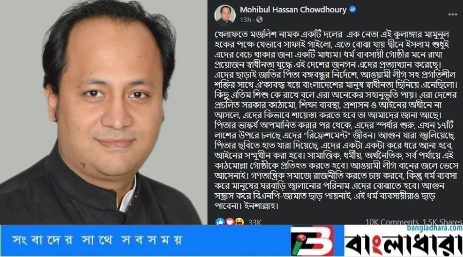 তিনি আরও লিখেন, ‘পিতার ভাস্কর্য অপমানিত করার পর থেকে, এদের স্পর্ধার শুরু, এখন ১৭টি লাশের উপরে চলছে এদের “রিফ্রেশমেন্ট” জীবন। আগুন যারা জ্বালিয়েছে, পিতার ছবিতে হাত যারা দিয়েছে, এদের একটা একটা করে ধরে আনা হবে, আইনের সম্মুখীন করা হবে। সামাজিক, ধর্মীয়, অর্থনৈতিক, সর্ব পর্যায়ে এই কাঠমোল্লা গোষ্ঠীকে প্রতিহত করতে হবে। আওয়ামী লীগ বানের জলে ভেসে আসেনাই। গণতান্ত্রিক সমাজে রাজনীতি করতে চায় করবে, কিন্তু ধর্ম ব্যবসা করে মানুষের ঘরবাড়ি জ্বালানোর পরিনাম এদের বোঝাতে হবে। আগুন সন্ত্রাস করে বিএনপি-জামাত ছাড় পায়নাই, এই ধর্ম ব্যবসায়ীরাও ছাড় পাবেনা। ইনশাল্লাহ।’