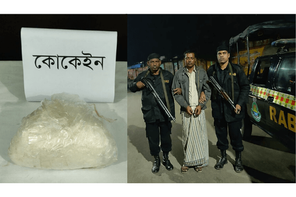 পরবর্তীতে আটককৃতের দেহ তল্লাশী করে ,ডান হাতে থাকা ১ টি লাল রংয়ের শপিং ব্যাগের ভিতর সাদা পলিথিনে মোড়ানো অবস্থায় ৮২০ গ্রাম সাদা পাউডার জাতীয় মাদক কোকেইন উদ্ধারসহ আসামীকে আটক করে র্যাব-৭।