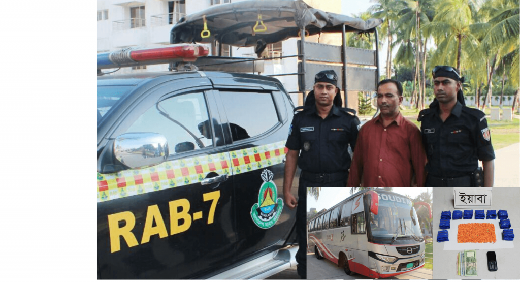 র্যাব-৭ এর পাঠানো এক প্রেস বিজ্ঞপ্তিতে বলা হয়, অভিযান চলাকালীন সময়ে চেকপোস্টের দিকে আসা বাস রেখে বাসচালক দৌড়ে পালিয়ে যাওয়ার চেষ্টা করলে র্যাব সদস্যরা তাকে আটক করে। এ সময় তার কাছে থেকে ১৯ হাজার ১১৫ পিস ইয়াবাসহ বাসটি জব্দ করা হয়।