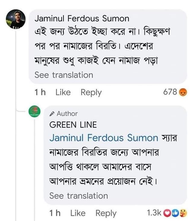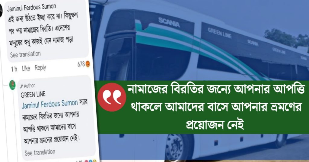 প্রতিউত্তরে গ্রিন লাইন কর্তৃপক্ষ বলে, ‘স্যার শুধু চেস্টা নয়, আমাদের বাসে ভ্রমন না করার জন্যে আহবান রইলো। এখানে আমরা শুধুমাত্র যাত্রীদের নামাজের বিরতি নিয়ে নির্দেশনা দিয়েছি, আরো বলেছি আমাদের বাসের ড্রাইভার এবং গাইড যাত্রীর নামাজ বিরতির নির্দেশনা মানতে বাধ্য থাকবে।’