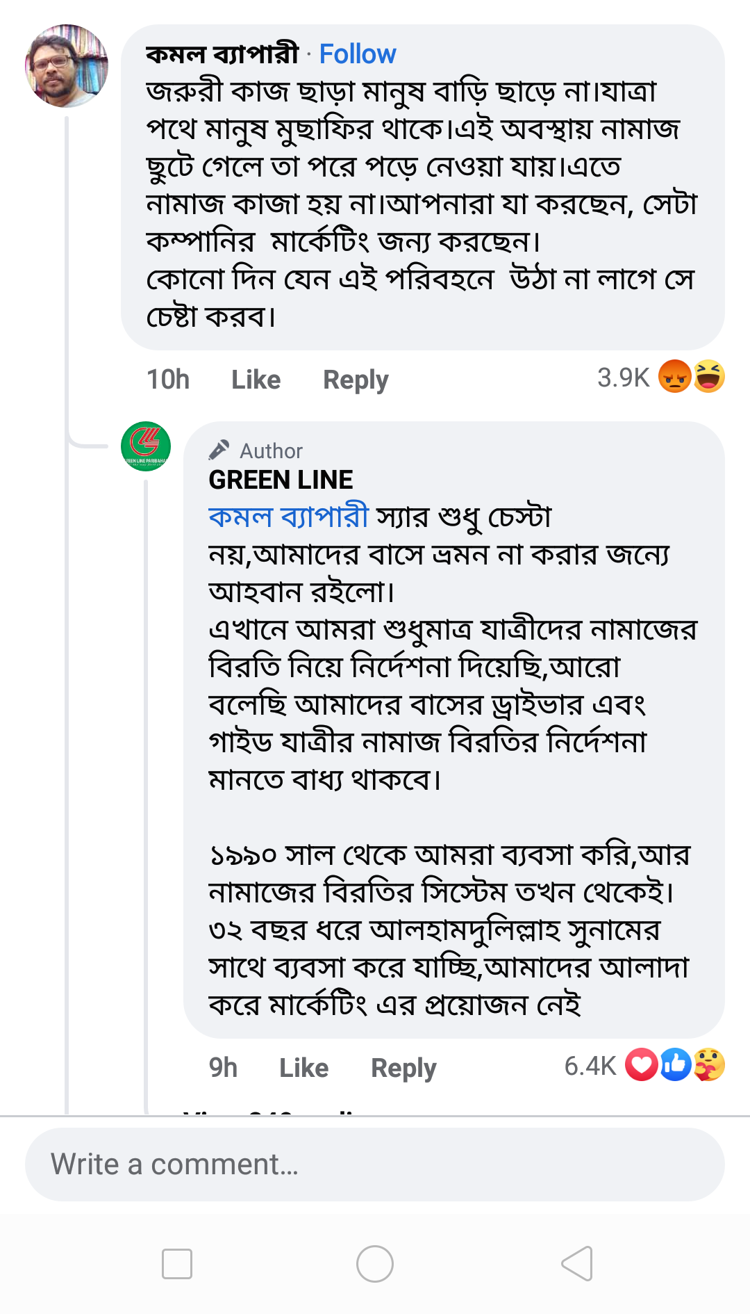 ওই একই পোস্টে কমল ব্যাপারি নামে একজন মন্তব্য করেন, ‘জরুরী কাজ ছাড়া মানুষ বাড়ি ছাড়ে না।যাত্রা পথে মানুষ মুছাফির থাকে।এই অবস্থায় নামাজ ছুটে গেলে তা পরে পড়ে নেওয়া যায়।এতে নামাজ কাজা হয় না।আপনারা যা করছেন, সেটা কম্পানির মার্কেটিং জন্য করছেন। কোনো দিন যেন এই পরিবহনে উঠা না লাগে সে চেষ্টা করব।’ (বানান অপরিবর্তিত)
