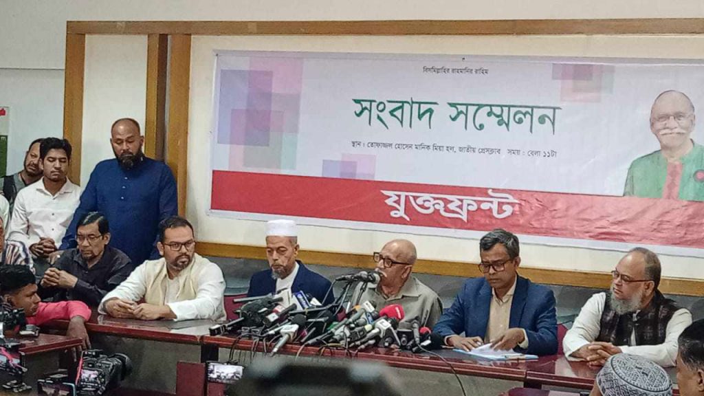 এর আগে বাংলাদেশ কল্যাণ পার্টির নেতৃত্বে নতুন জোট হিসেবে আত্মপ্রকাশ করেছে ‘যুক্তফ্রন্ট’। সকালে জাতীয় প্রেসক্লাবের তোফাজ্জল হোসেন মানিক মিয়া হলে সংবাদ সম্মেলনে এই জোট ঘোষণা করেন জোট প্রধান ও কল্যাণ পার্টির চেয়ারম্যান মেজর জেনারেল (অব.) সৈয়দ মুহাম্মদ ইবরাহিম।
