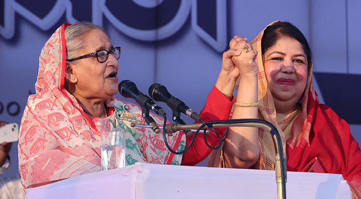এ সময় মঞ্চে উপস্থিত ছিলেন প্রধানমন্ত্রী শেখ হাসিনার ছোট বোন শেখ রেহানা।