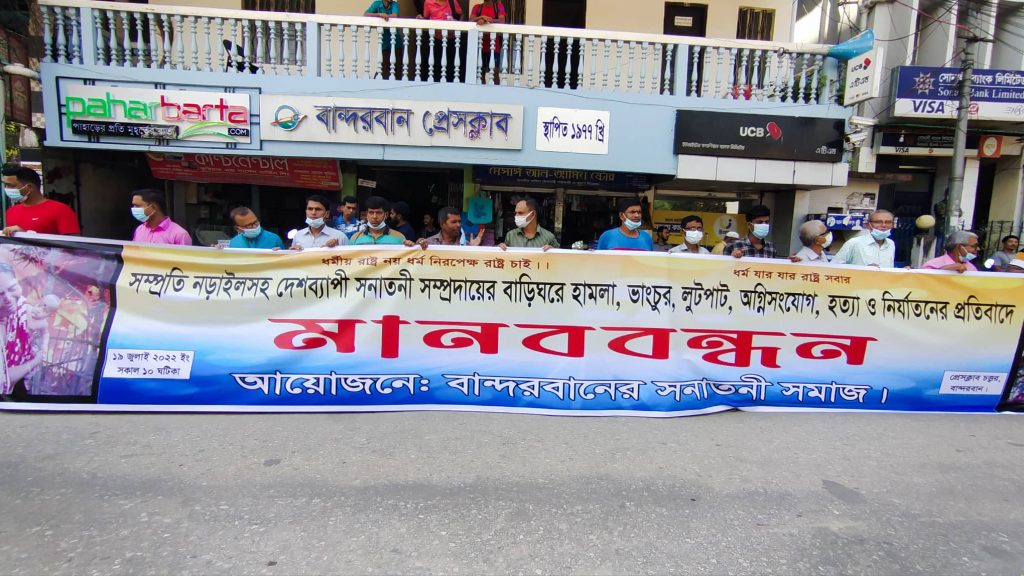 মঙ্গলবার (১৯ জুলাই) সকালে বান্দরবান বঙ্গবন্ধু মুক্ত মঞ্চে সামনে বান্দরবান সনাতনী সমাজ আয়োজনে এ মানববন্ধন অনুষ্ঠিত হয়।