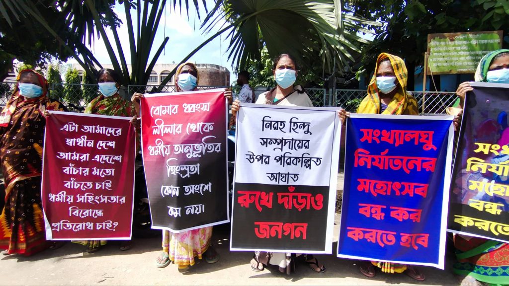 এ সময় শতশত সনাতন ধর্মাবলম্বীরা বিভিন্ন ফেস্টুন ও ব্যানার হাতে নিয়ে নারী পুরুষ মানববন্ধনে অংশ নেন।