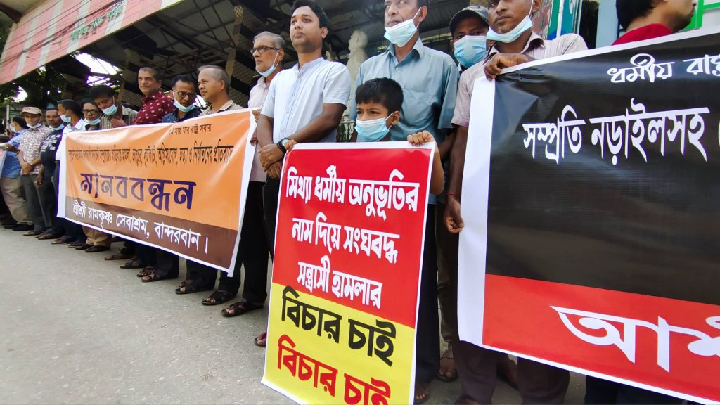 মঙ্গলবার (১৯ জুলাই) সকালে বান্দরবান বঙ্গবন্ধু মুক্ত মঞ্চে সামনে বান্দরবান সনাতনী সমাজ আয়োজনে এ মানববন্ধন অনুষ্ঠিত হয়।