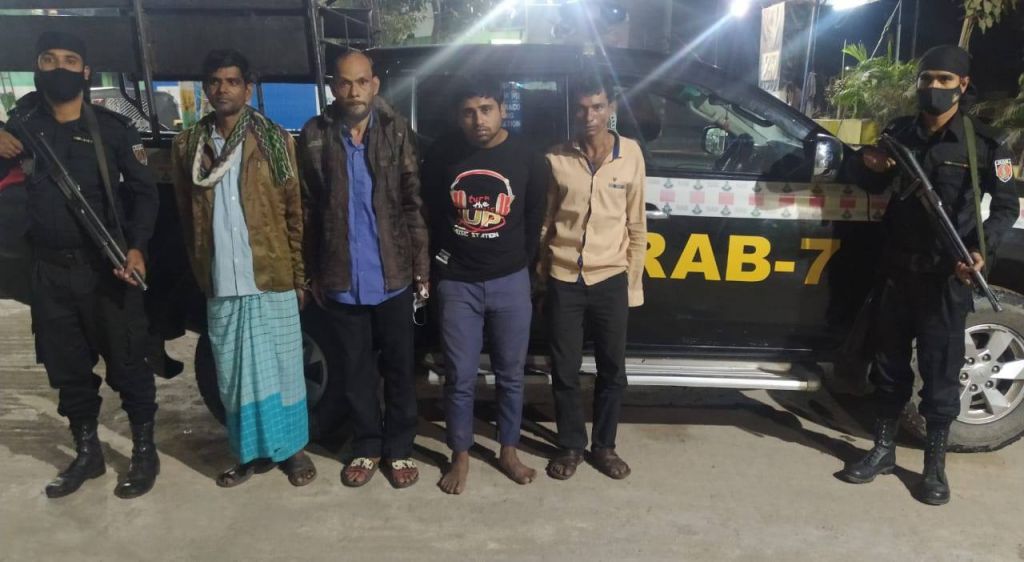 উক্ত সংবাদের ভিত্তিতে গত ২৪ নভেম্বর র্যাব-৭ এর একটি আভিযানিক দল বর্ণিত স্থানে অভিযান পরিচালনা করে মো. গিয়াস উদ্দিন (২৮), মঈনুল ইসলাম (২৬), মো. আনোয়ার হোসেন (৪৫), মো. বাবুল উদ্দিন (৪২) নামে ৪ জনকে আটক করে।