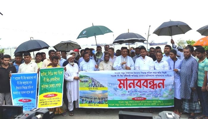 চট্টগ্রামের পতেঙ্গা সমুদ্র সৈকত বেসরকারি প্রতিষ্ঠানকে ইজারা দেওয়ার সিদ্ধান্তের প্রতিবাদে এবং সৈকতের ক্ষতিগ্রস্ত দোকান মালিকদের পুনর্বাসন ও সৈকতের মূল ফটক খুলে দেওয়ার দাবিতে সমাবেশ ও মানববন্ধন অনুষ্ঠিত হয়েছে। মানববন্ধনে সৈকতের ৫ শতাধিক দোকান মালিক ও কর্মচারী এবং স্থানীয় জনতা অংশগ্রহণ করে।