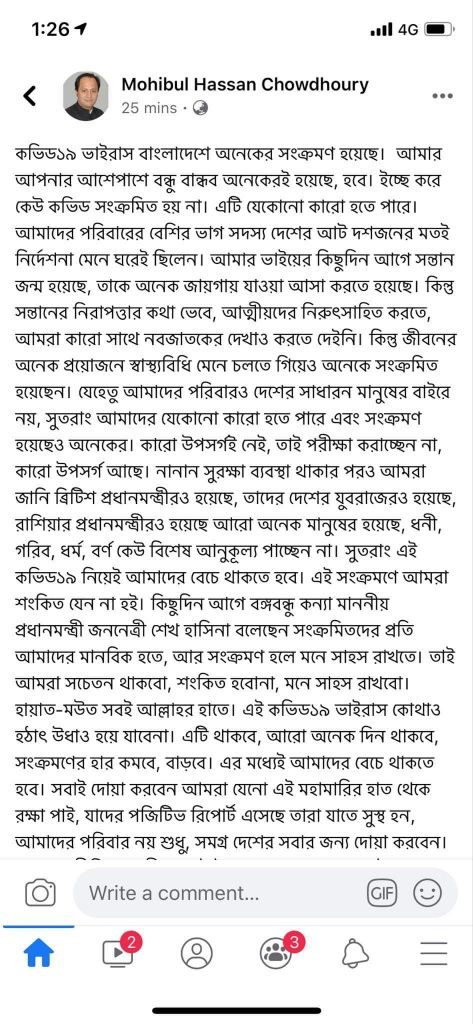 যেহেতু আমাদের পরিবারও দেশের সাধারন মানুষের বাইরে নয়, সুতরাং আমাদের যেকোনো কারো হতে পারে এবং সংক্রমণ হয়েছেও অনেকের। কারো উপসর্গই নেই, তাই পরীক্ষা করাচ্ছেন না, কারো উপসর্গ আছে। নানান সুরক্ষা ব্যবস্থা থাকার পরও আমরা জানি ব্রিটিশ প্রধানমন্ত্রীরও হয়েছে, তাদের দেশের যুবরাজেরও হয়েছে, রাশিয়ার প্রধানমন্ত্রীরও হয়েছে আরো অনেক মানুষের হয়েছে, ধনী, গরিব, ধর্ম, বর্ণ কেউ বিশেষ আনুকূল্য পাচ্ছেন না।