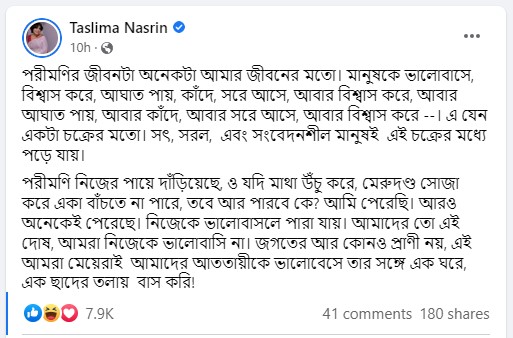 পরীর সমর্থনে তসলিমা আরও লিখেছেন, ‘পরীমণি নিজের পায়ে দাঁড়িয়েছে। ও যদি মাথা উঁচু করে, মেরুদণ্ড সোজা করে একা বাঁচতে না পারে, তবে আর পারবে কে? আমি পেরেছি। আরও অনেকেই পেরেছে। নিজেকে ভালোবাসলে পারা যায়। আমাদের তো এই দোষ, আমরা নিজেকে ভালোবাসি না। জগতের আর কোনও প্রাণী নয়, এই আমরা মেয়েরাই আমাদের আততায়ীকে ভালোবেসে তার সঙ্গে এক ঘরে, এক ছাদের তলায় বাস করি!’