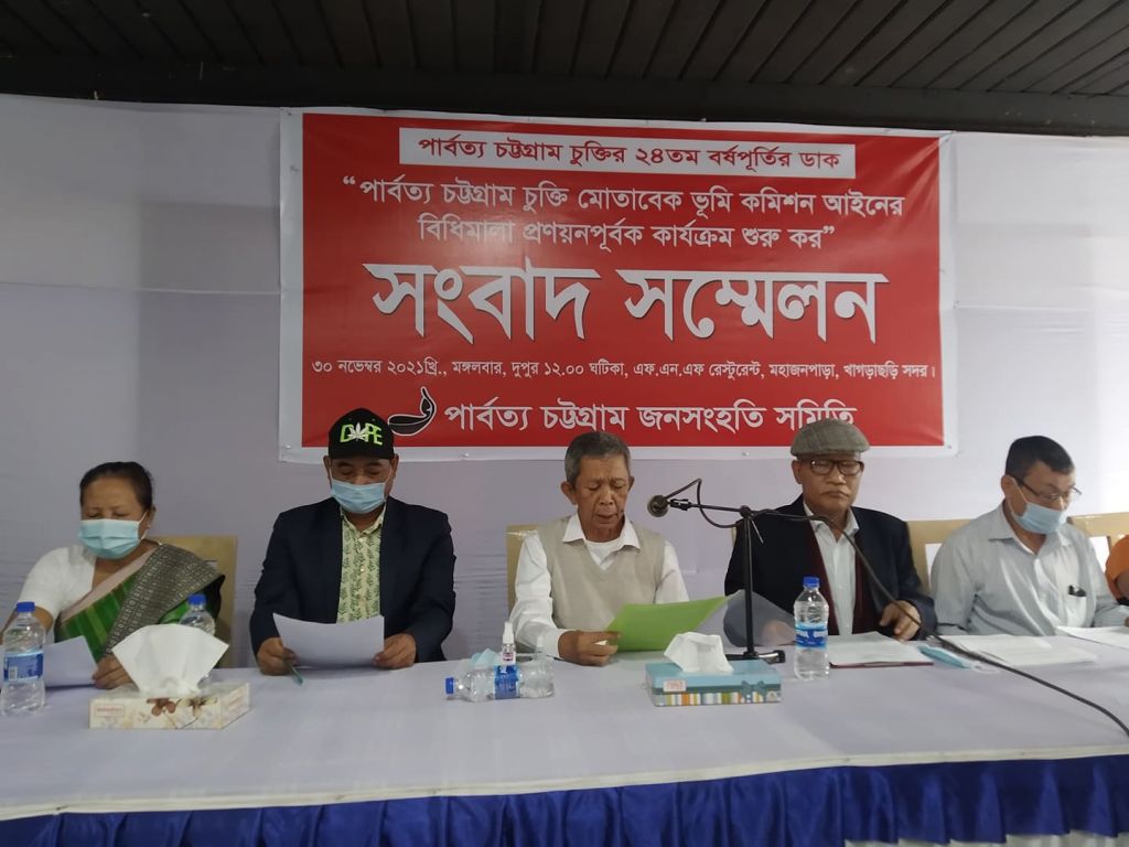 পাহাড়ের ভূমি সমস্যা নিরসনে পার্বত্য চুক্তি মোতাবেক ভূমি কমিশনের বিধিমালা প্রণয়নপূর্বক দ্রুত বিচারিক কার্যক্রম শুরু করা, পার্বত্য চট্টগ্রাম চুক্তির আলােকে ১৯০০ সালের পার্বত্যচট্টগ্রাম শাসনবিধি কার্যকর রাখা। পার্বত্য চট্টগ্রাম আঞ্চলিক পরিষদ ও তিন পার্বত্য জেলা পরিষদে সাধারণ প্রশাসন, স্থানীয়পুলিশ, ভূমি ও ভূমি ব্যবস্থাপনা, উপজাতীয় আইন ও সামাজিক বিচার কার্যাবলী ও ক্ষমতা নির্বাহী আদেশের মাধ্যমে হস্তান্তর করাসহ ৭ দফা দাবিতে খাগড়াছড়িতে সংবাদ সম্মেলন করেছে পার্বত্য চট্টগ্রাম জনসংহতি সমিতি।