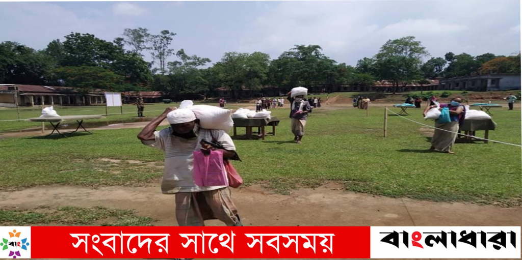 গুইমারা রিজিয়নের সহযোগিতায় এবং মাটিরাঙ্গা জোনের ব্যবস্থাপনায় মাটিরাঙ্গা সসরকারী উচ্চ বিদ্যালয় মাঠে আয়োজিত এক মিনিটের ঈদ বাজারে টেবিলের উপর থরে থরে সাজানো চাল, আটা, তৈল, লবন, সুজি, চিনিও নুডুলসহ ঈদের পণ্য সংগ্রহ করেছেন আগতরা। সাথে সবাই নিয়ে গেছেন ঈদের নতুন শাড়ি ও লুঙ্গী।