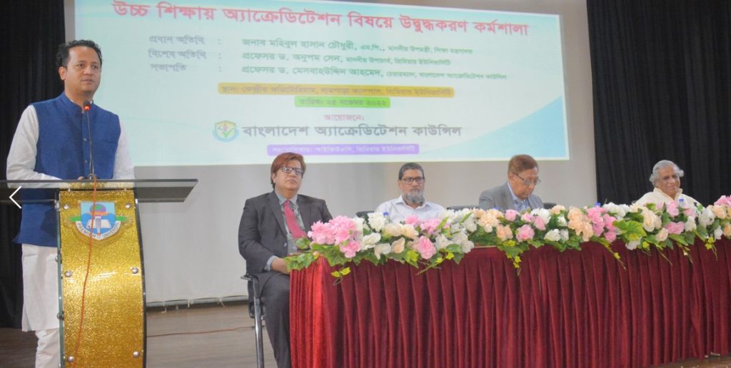 শিক্ষা উপমন্ত্রী ব্যারিস্টার মহিবুল হাসান চৌধুরী প্রধান অতিথির বক্তব্যে বলেন, অ্যাক্রেডিটেশন বাংলাদেশের জন্য একটি যুগান্তকারী প্রসেস। প্রধানমন্ত্রী বঙ্গবন্ধু-কন্যা শেখ হাসিনা উচ্চশিক্ষার মান নিয়ন্ত্রণে জোর দিয়েছেন। উচ্চশিক্ষার কাজ যেভাবে সম্প্রসারিত হয়েছে, তাতে যারা অংশগ্রহণ করছে, তাদের কর্মসংস্থান থেকে শুরু করে তাদের মান নিয়ন্ত্রণ করা, তাদের যোগ্যতা নির্ধারণ করা এবং সুনির্দিষ্ট মাত্রায় তাদের যে-শিখনফল তা অর্জিত হয়েছে কিনা দেখাটা অত্যন্ত গুরুত্বপূর্ণ হয়ে গিয়েছে। কারণ আমাদের বিশাল একটা জনগোষ্ঠী এখন উচ্চশিক্ষাখাতে আসছে। সামাজিক এবং সংস্কৃতিগত কারণে উচ্চশিক্ষায় যাওয়া এই অঞ্চলের সামাজিক বৈশিষ্ট্য। কিন্তু শিক্ষার্থীরা উচ্চশিক্ষা গ্রহণের পর কাম্য যোগ্যতা অর্জন করেছে কিনা, তাদের মধ্যে কর্মজগতে প্রবেশের দক্ষতাগুলো সৃষ্টি হয়েছে কিনা, তা একাডেমিকও হতে পারে, নন একাডেমিকও হতে পারে, দেখাটা দরকার। সুতরাং উচ্চশিক্ষা প্রতিষ্ঠানগুলো যথাযথভাবে আন্তর্জাতিক বা বৈশ্বিক মানদ- যদি বজায় না রাখে তা শিক্ষার্থীদের সঙ্গে প্রতারণামূলকই হবে। শিক্ষার্থীদের বলছি, উচ্চশিক্ষা প্রতিষ্ঠানে আসো, উচ্চশিক্ষা গ্রহণ কর, কিন্তু মান নিশ্চিত করার ক্ষেত্রে তাদের সেই কাক্সিক্ষত শিক্ষা, দক্ষতা দিতে পারছি না। তারা কর্মজগতে প্রবেশ করে দেখতে পাচ্ছে সেই কাক্সিক্ষত শিক্ষা, দক্ষতার অভাবে তারা অনুপুযুক্ত। এ কারণে উচ্চশিক্ষা প্রতিষ্ঠানগুলোর গুণগত মান নিশ্চিত করার জন্য বাংলাদেশ অ্যাক্রেডিটেশন কাউন্সিলের সৃষ্টি হয়েছে।