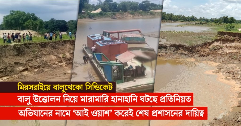মিরসরাই উপজেলার ১ নং করেরহাট ইউনিয়ন ও ২নং হিঙ্গুলী ইউনিয়ন এলাকায় প্রতিনিয়ত নিয়ম-নীতির তোয়াক্কা না করেই ফেনী নদী থেকে অবৈধভাবে বালু উত্তোলন করা হচ্ছে। ফলে ফেনী নদীর ভাঙনে ছোট হয়ে আসছে মিরসরাইয়ের জনবসতি। প্রতিদিন নতুন নতুন এলাকা ভাঙনের মুখে পড়ছে।