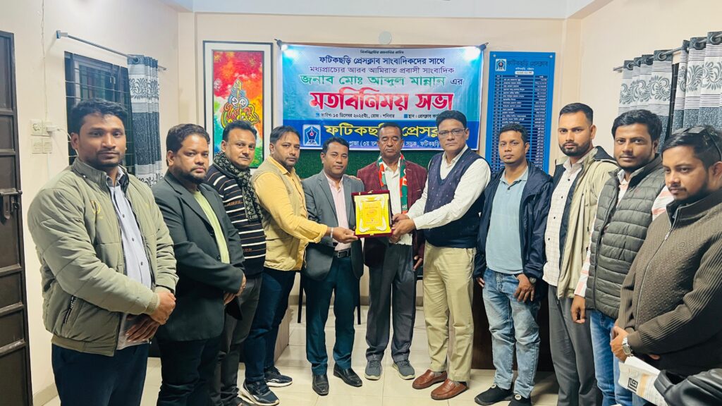 ফটিকছড়ি প্রেসক্লাবের নেতৃবৃন্দের সঙ্গে মতবিনিময় করেছেন মধ্যপ্রাচ্যের দেশ সংযুক্ত আরব আমিরাত প্রবাসী সাংবাদিক ও ফটিকছড়ির লেলাং ইউনিয়নের সন্তান, প্রেসক্লাবের নবাগত প্রবাসী সদস্য আব্দুল মান্নান রানা।