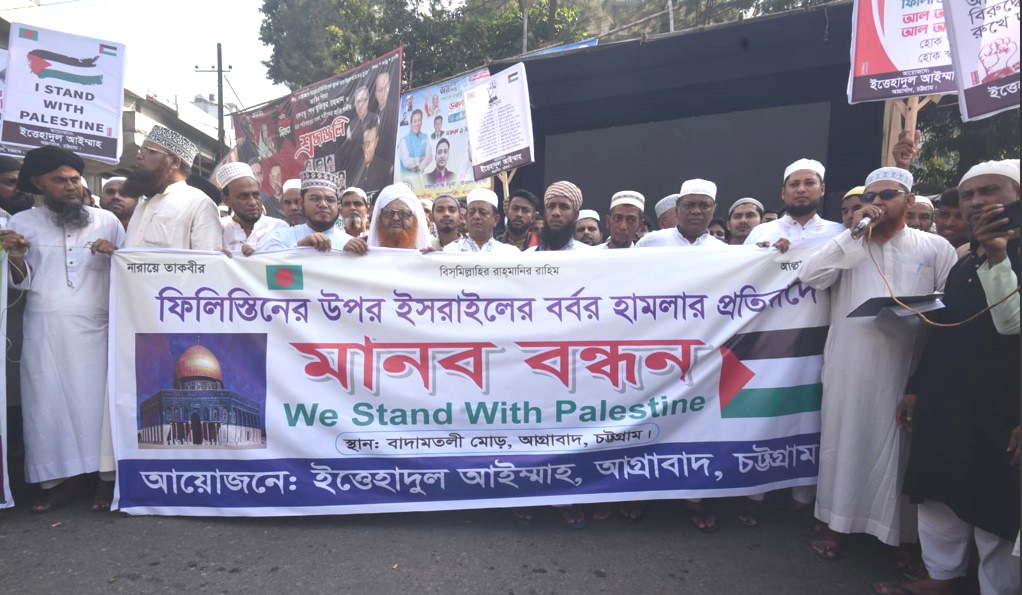 ফিলিস্তিনিদের উপর বর্বর ইসরায়েলী হামলার প্রতিবাদে চট্টগ্রামে মানববন্ধন করেছে ইত্তেহাদুল আইম্মাহ নামের একটি সংগঠন। মানববন্ধনে চট্টগ্রামের ওলামা মশায়েখ, বিভিন্ন মসজিদের মুসল্লি, ছাত্র-শিক্ষক, পেশাজীবী, শ্রমজীবীসহ ইসলাম প্রিয় তৌহিদি জনতার স্বতঃস্ফূর্ত অংশগ্রহণ করেন।