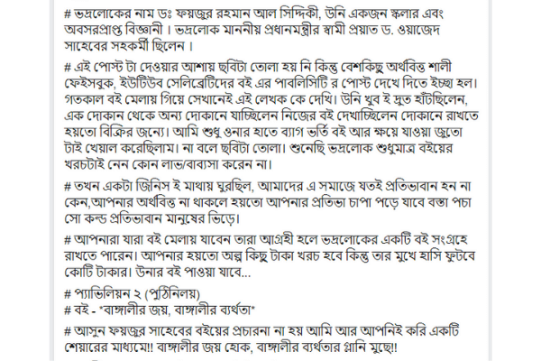‘আপনারা যারা বই মেলায় যাবেন তারা আগ্রহী হলে ভদ্রলোকের একটি বই সংগ্রহে রাখতে পারেন। আপনার হয়তো অল্প কিছু টাকা খরচ হবে কিন্তু তার মুখে হাসি ফুটবে কোটি টাকার। উনার বই পাওয়া যাবে…প্যাভিলিয়ন ২ (পুঠিনিলয়), বই – বাঙ্গালীর জয়, বাঙ্গালীর ব্যর্থতা’