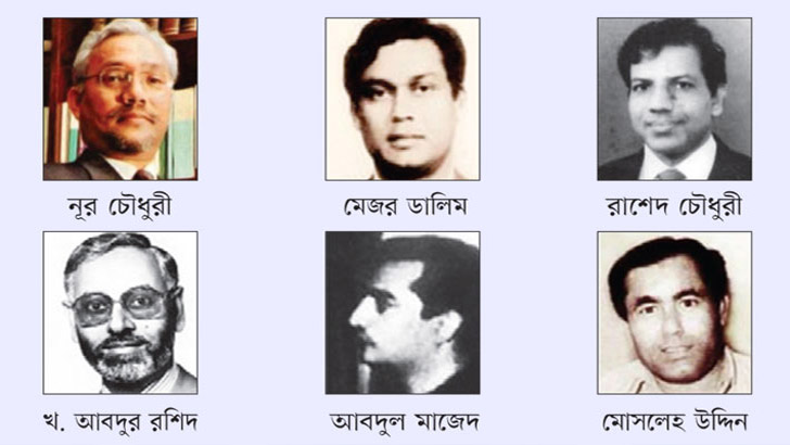 এখনও অধরা ৬ খুনি : বিভিন্ন দেশে পালিয়ে বেড়াচ্ছে লে. কর্নেল (বরখাস্ত) খন্দকার আবদুর রশিদ, মেজর (বরখাস্ত) শরিফুল হক ডালিম, লে. কর্নেল (অব.) এএম রাশেদ চৌধুরী, মেজর (অব.) এসএইচএমবি নূর চৌধুরী, ক্যাপ্টেন (অব.) আবদুল মাজেদ ও রিসালদার মোসলেম উদ্দিন খান। গ্রেফতার বা প্রত্যর্পণ ঠেকাতে যুক্তরাষ্ট্র, কানাডা, পাকিস্তান, লিবিয়াসহ আফ্রিকা ও ইউরোপের বিভিন্ন দেশে বারবার অবস্থান বদল করেছে খুনিরা।