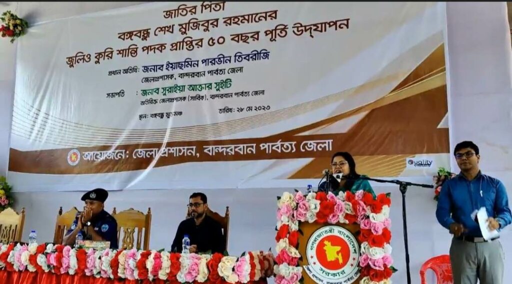 সকালে বঙ্গবন্ধু মুক্তমঞ্চে বান্দরবান জেলা প্রশাসনের আয়োজনে আলোচনা সভায় প্রধান অতিথি হিসেবে উপস্থিত ছিলেন জেলা প্রশাসক ইয়াছমিন পারভীন তিবরীজি।