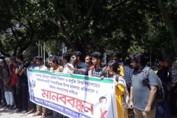 রবিবার ( ২২সেপ্টেম্বর) বিশ্ববিদ্যালয়ের শহীদ মিনার চত্বরে মানববন্ধনটি অনুষ্ঠিত হয়। এতে বিশ্ববিদ্যালয়ের বিভিন্ন বিভাগের সাধারণ শিক্ষার্থী ও সমাজতত্ত্ব বিভাগের সহযোগী অধ্যাপক মাইদুল ইসলাম উপস্থিত থেকে সমর্থন জানান।