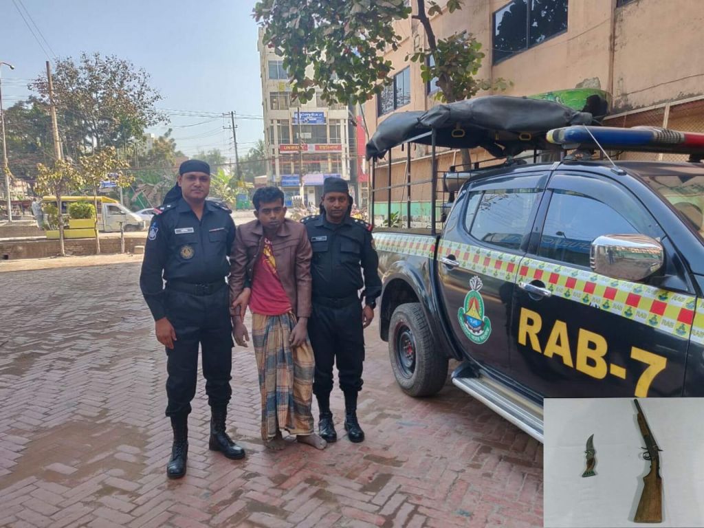 পরবর্তীতে আটককৃতের দেহ তল্লাশী করে পরিহিত লুঙ্গির কোচের ভিতরে লুকানো অবস্থায় ১ টি ষ্টিলের টিপ ছুরি ও ব্যাপক জিজ্ঞাসাবাদে বাঁশঝাড়ের ভিতর লুকানো অবস্থায় ১ টি একনালা বন্দুক উদ্ধার করে র্যাব-৭।