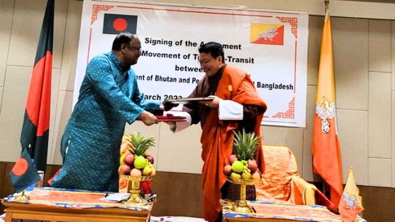 বুধবার (২২ মার্চ) ভুটানের রাজধানী থিম্পুতে ‘প্রটোকল অব দ্য এগ্রিমেন্ট অন দ্য মুভমেন্ট অব ট্রাফিক ইন ট্রানজিট বিটুইন বাংলাদেশ অ্যান্ড ভুটান’ এই শিরোনামে দুই দেশের মধ্যে চুক্তি স্বাক্ষর হয়। চুক্তি স্বাক্ষর অনুষ্ঠানে বাণিজ্যমন্ত্রী এ কথা জানান।