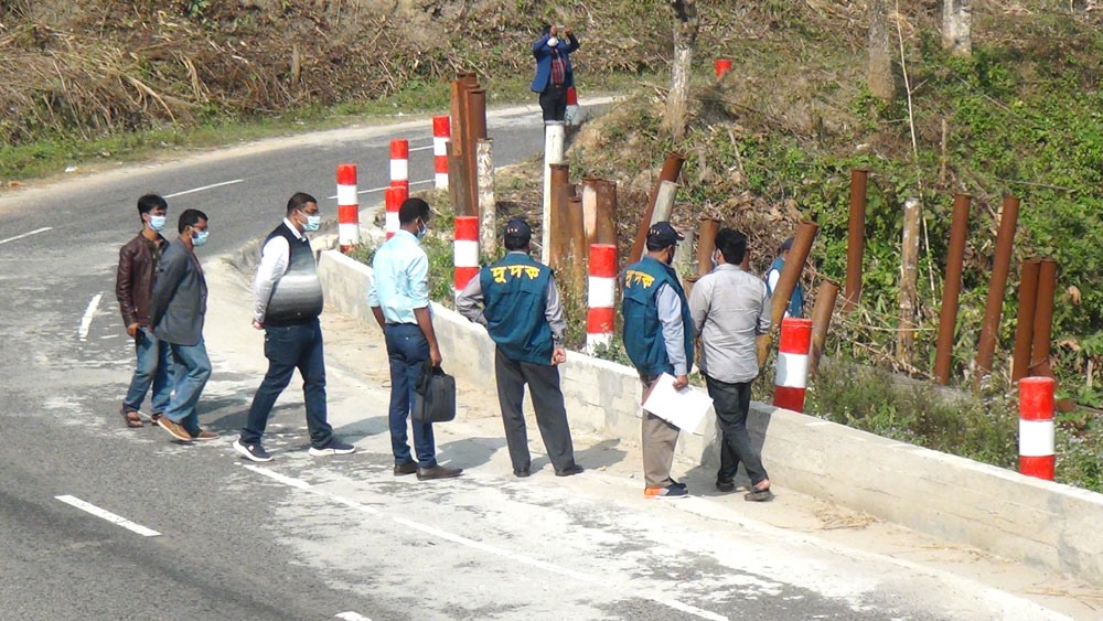এদিকে সরেজমিনে দেখা যায়, কুকিমারা চেকপোষ্টের সামনের সড়কেই নিন্মমানের সামগ্রী দিয়ে তৈরি করা ড্রেনসহ সড়কের উপরের অংশে বেশ লম্বা ফাটল ধরেছে। মুরালী পাড়া এলাকায় স্থাপনের কিছুদিনের মধ্যেই হেলে পড়েছে এমএস পাইপ প্যালাসাইডিং।