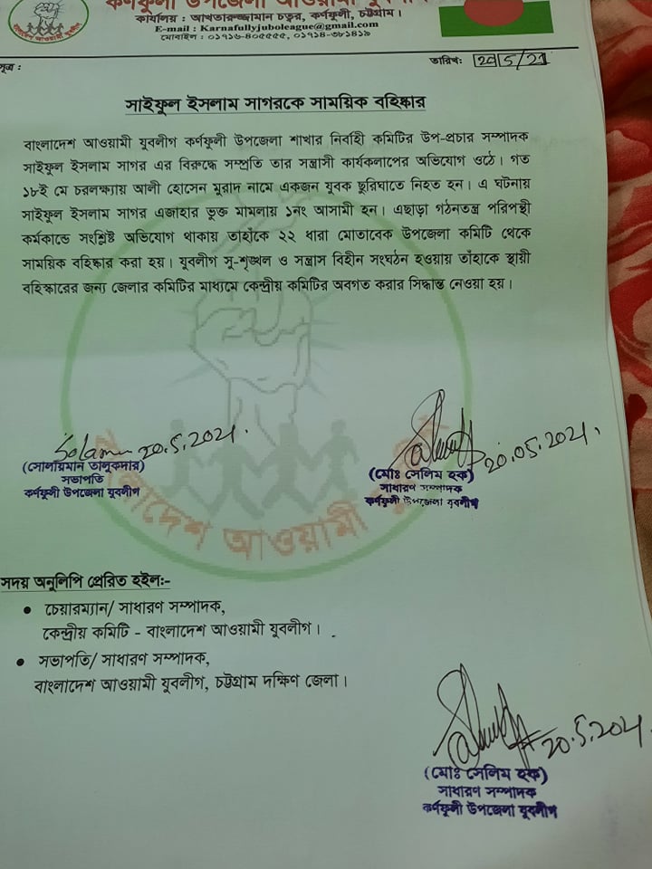 বৃহস্পতিবার (২০ মে) রাতে উপজেলা যুবলীগের সভাপতি সোলায়মান তালুকদার এবং সাধারণ মো. সেলিম হক স্বাক্ষরিত এক প্রেস বিজ্ঞপ্তিতে তাকে বহিষ্কারের কথা জানানো হয়েছে। শৃঙ্খলা পরিপন্থী কাজে জড়িত থাকায় তাকে বহিষ্কার করা হয়েছে বলে এ তথ্য নিশ্চিত করেছেন কর্ণফুলী উপজেলা যুবলীগের সাধারণ সম্পাদক মো. সেলিম হক।