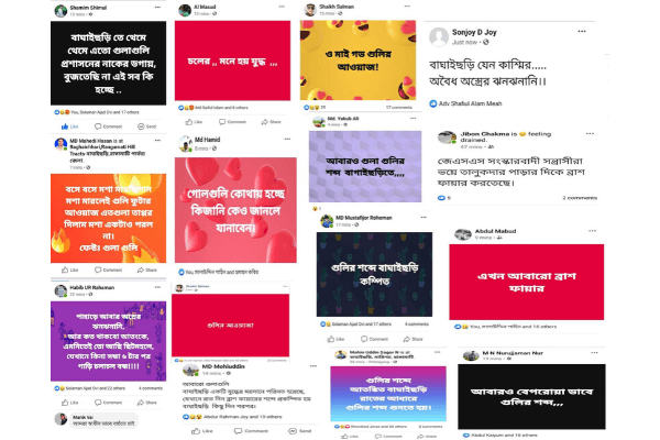 এদিকে থেমেথেমে চলা মুর্হুমুহু গুলির শব্দে প্রকম্পিত বাঘাইছড়ি উপজেলা সদরে আতঙ্কিত বাসিন্দাদের অনেকেই সোস্যাল মিডিয়ায় স্ট্যাটাস দিয়ে নিজেদের অসহায়ত্বের কথা প্রকাশ করছে।