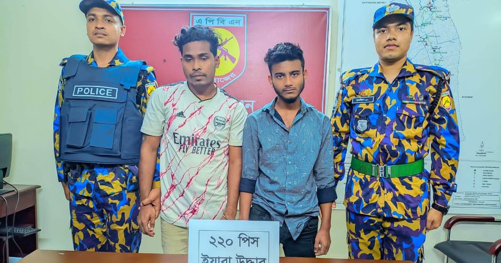 আর্মড পুলিশ জানায়, গোপন সংবাদের ভিত্তিতে অভিযানকালে ইয়াবাসহ দুই যুবককে আটক করা হয়েছে। এসময় ২২০ পিস ইয়াবাসহ একটি মোটরসাইকেল ও দুটি মোবাইল ফোন জব্দ করা হয়। যার বাজার মূল্য আনুমানিক সাড়ে ষাট হাজার টাকা।