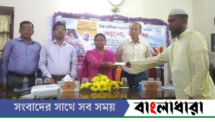 অনুষ্ঠান শেষে অসহায় ও দুস্থ মানুষের মাঝে চেক বিতরণ করেন অতিথিবৃন্দ।